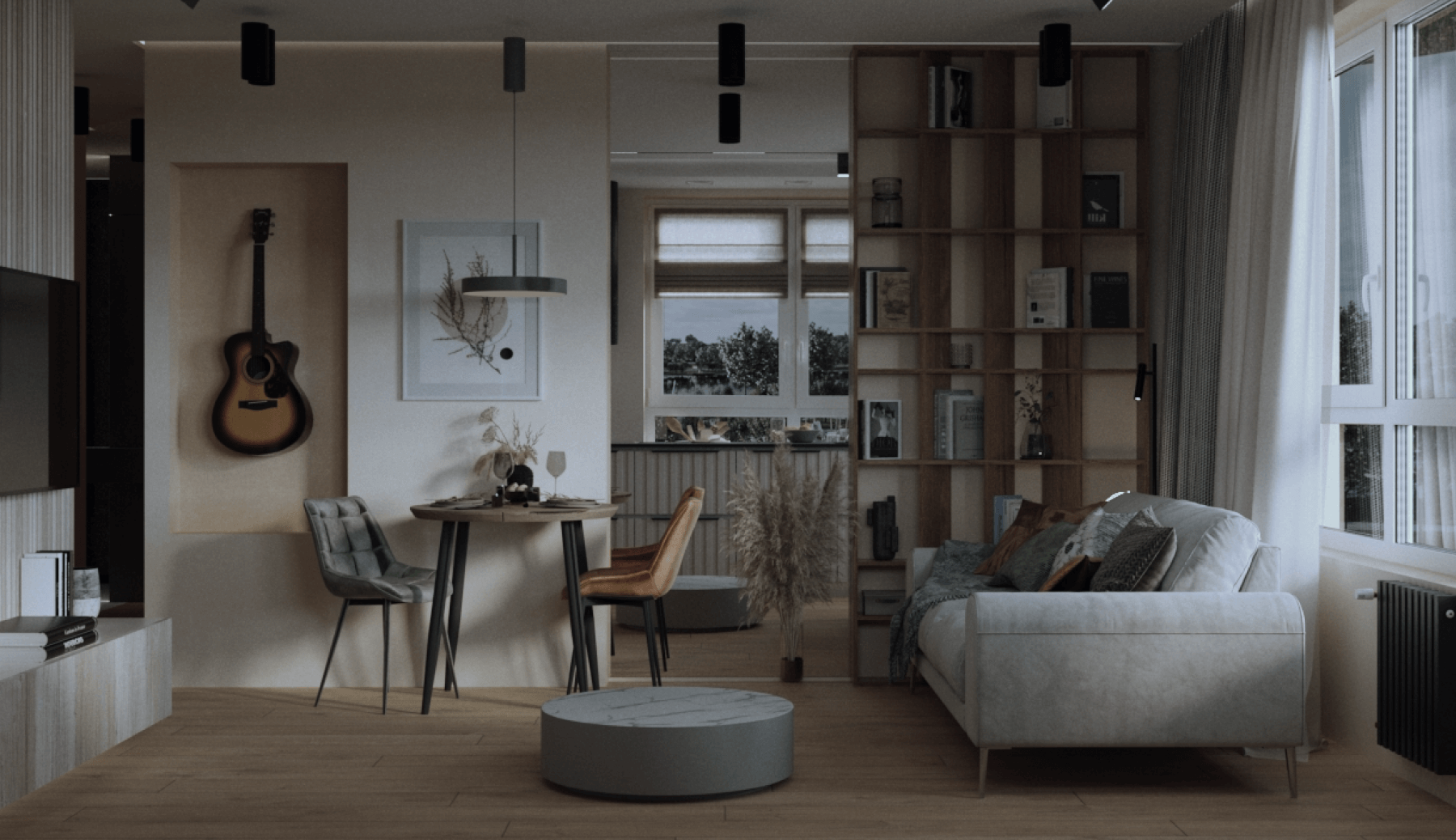 Необходимо было разместить изолированную спальню с размером матраса 1600, предусмотреть два рабочих места, место для макияжа, большой душ без поддона и кухню с большой рабочей поверхностью.